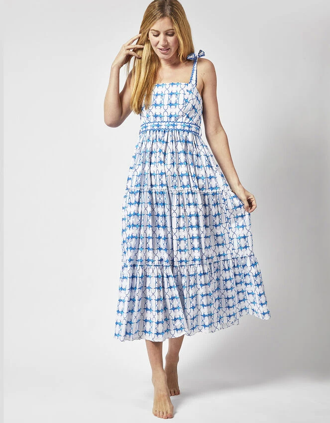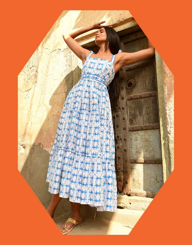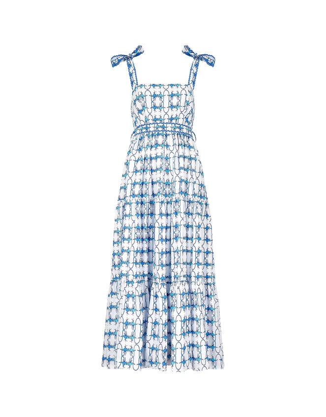 For fine alfresco dining, overlooking the ocean as the sun sets, this is where we see the Willa dress. Falling to midi length, it features a blue and white floral print, with a square neckline that can be dressed with a single pendant necklace. Sat in a tiered profile, it’s beautifully airy with ties found in the straps and waist for a customisable fit.