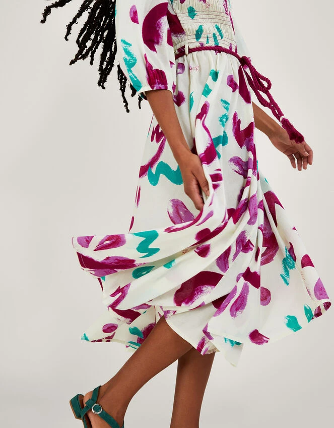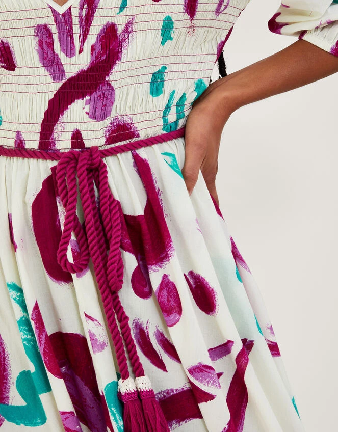 With its bright and beautiful brushstroke print, this dress was made for strolling along the sandy shores. The bodice is shirred down to the waistline for comfort, with a fuchsia rope tie-belt for a bohemian touch. The relaxed skirt falls to a midi-length that’ll brush your calves as the breeze catches it.