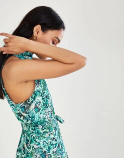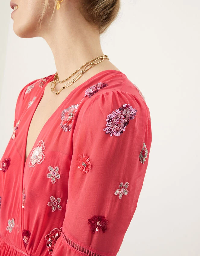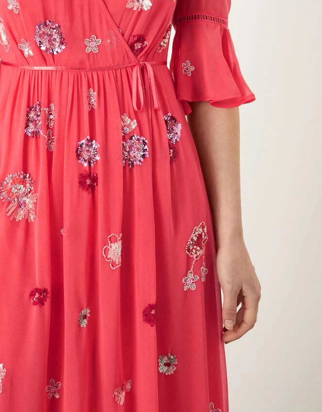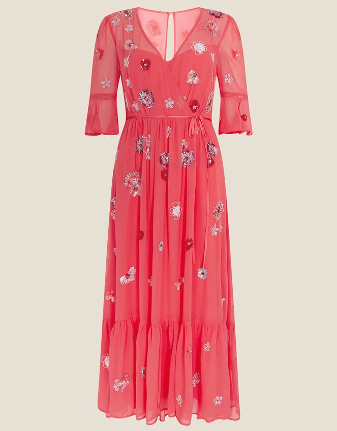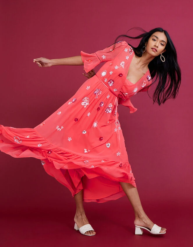 Stand out amongst the summery green backdrop with this coral beauty. Adorned with sparkling florals, Aimee is designed in a classic wrap style with frill detailing to the hem and sleeves, pairing perfectly with your best neutral heels.