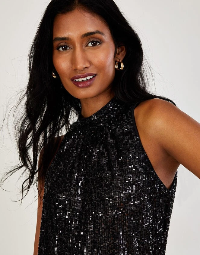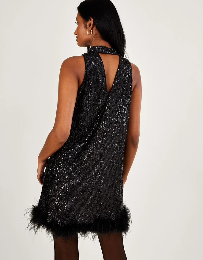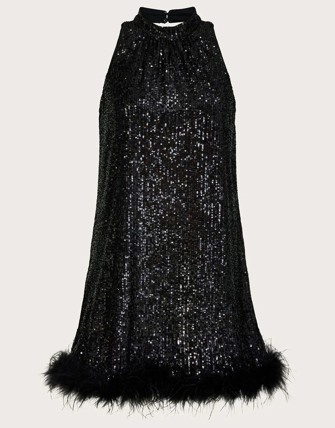 MONSOON Aly Sequin Feather Trim Halter Dress Black