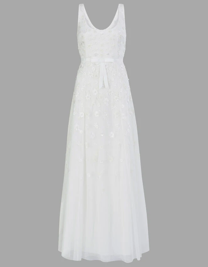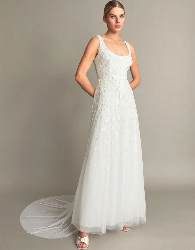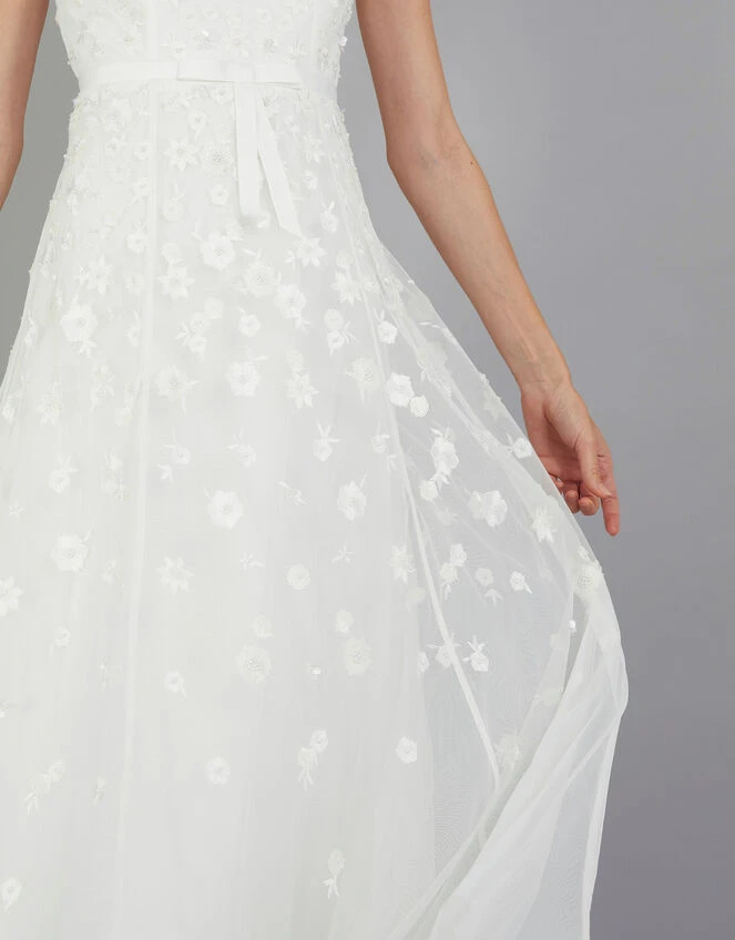 Take their breath away when walking down the aisle in Amelie, our beautifully detailed bridal gown. It boasts a scoop neckline and feminine floral embroidery to the bodice, fitting firmly to sculpt your figure. The skirt flows effortlessly down creating natural pleats, complete with further embroidered flowers to the draped mesh. The reverse offers a scoop back, with a fabric coated button-through fastening and a small bow to the waist for those little touches of detail.