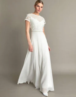 When simplicity meets a touch of lace; our Angela gown provides the best of both worlds. Find the intricate floral lace through the bodice and short sleeves, with accent touches through the neckline trim. Defining the waist and bust sits an understated tape lace, complementing the untouched, plain skirt that falls beneath with a floaty overlay of mesh. Twirl it around to see the keyhole button fastening and concealed zip. Ivory