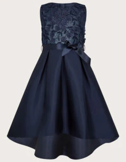 Perfect for weddings and christenings where ivory isn’t on the dresscode, our Anika dress is created in duchess twill with floral embroidery and 3D appliques. The skirt is pleated with a high low hemline and the back fastens with a concealed zip. Fully lined. Blue