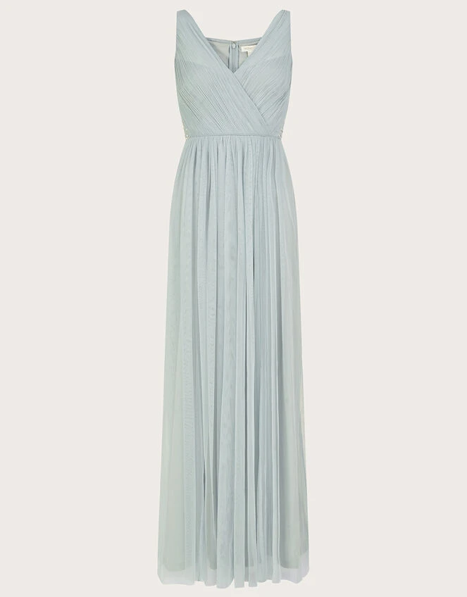 Anne airily falls into an angel-like fit with ruched mesh throughout the crossover bodice and pleats through the maxi skirt. Her silver hue is accompanied by cool-tone sequins on the back panel and straps ensuring even when your back is turned, you’re still shining. Fastens on the reverse with a zipper.