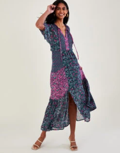 Pops of pink adorn this dress, featuring a patchwork floral print. It’s cut in a relaxed silhouette, with a shirt-style bodice and a deep v neckline. Cinching in at the waist, this piece will keep your shape before it falls into a wispy maxi skirt. Blue