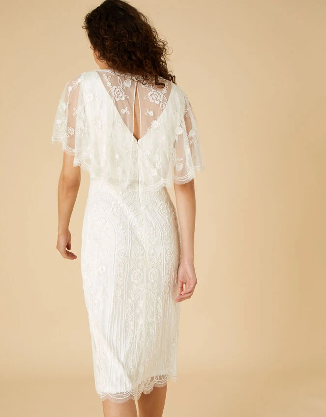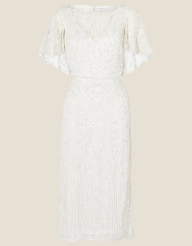 The perfect dress for relaxed wedding settings, our Audrey gown is designed to finish just below the knee. She comes covered in intricate embellishments and cut with angel sleeves that emerge into a floaty, cape-style layer on the reverse.
