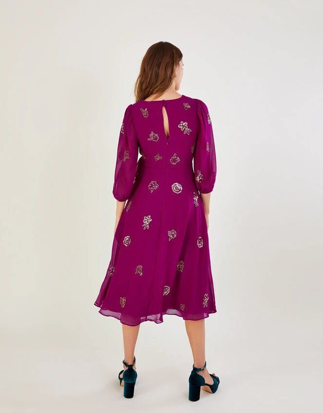 Move freely in Ava’s magenta moment, ensuring she’s seen with floral embellishments all-over. Her airy profile combines cropped bishop sleeves with a knee length skirt that swishes gracefully, sitting slim at the waist with a wrap tie.