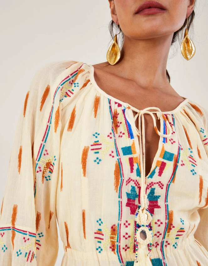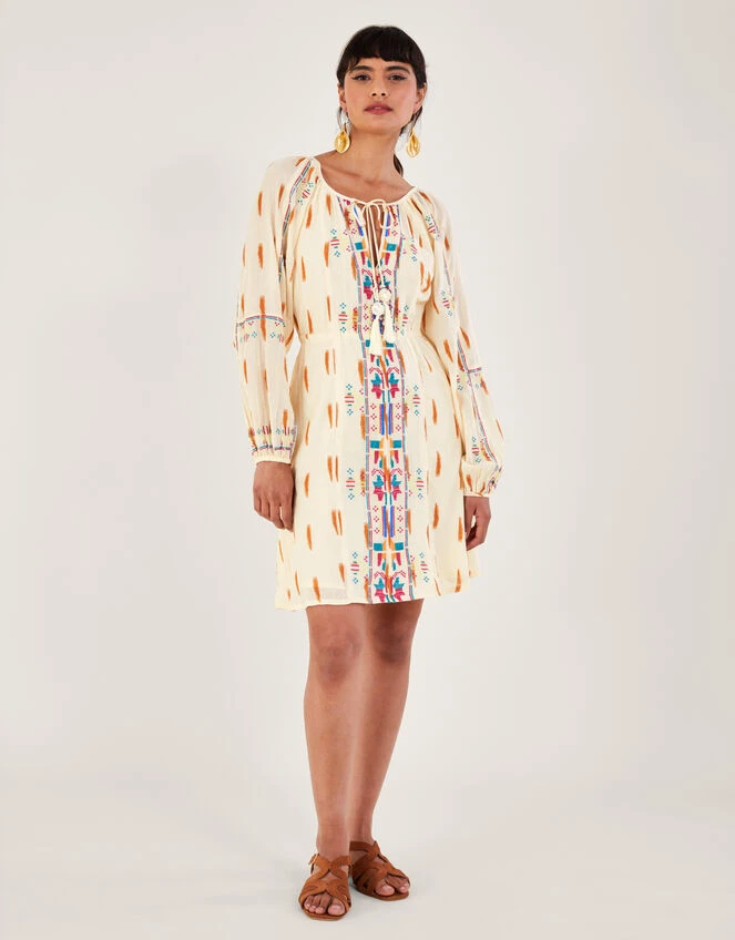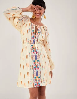 Aptly decorated for summer sessions in the garden, this dress is designed with an all over aztec print with matching embroidery that cascades down the front. The shorter length adds a playful touch, with relaxed sleeves, and a tassel tie neckline.