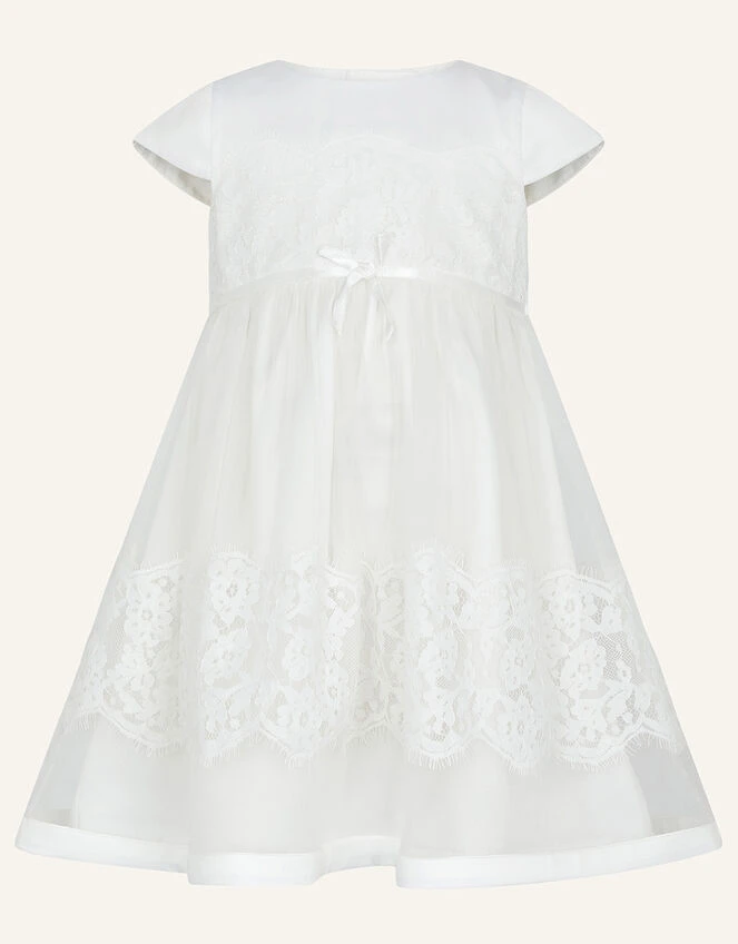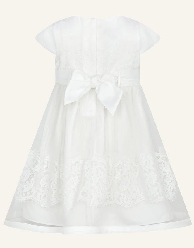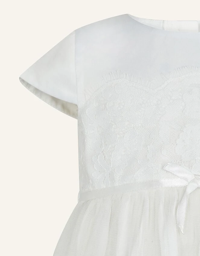 This special style combines crisp white organza with delicate lace. A favourite for Christenings. Ivory