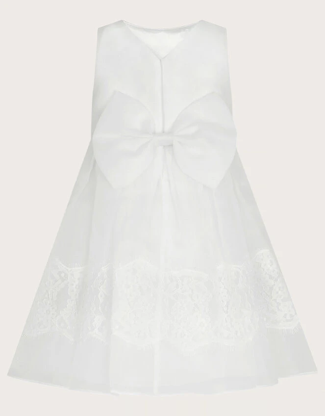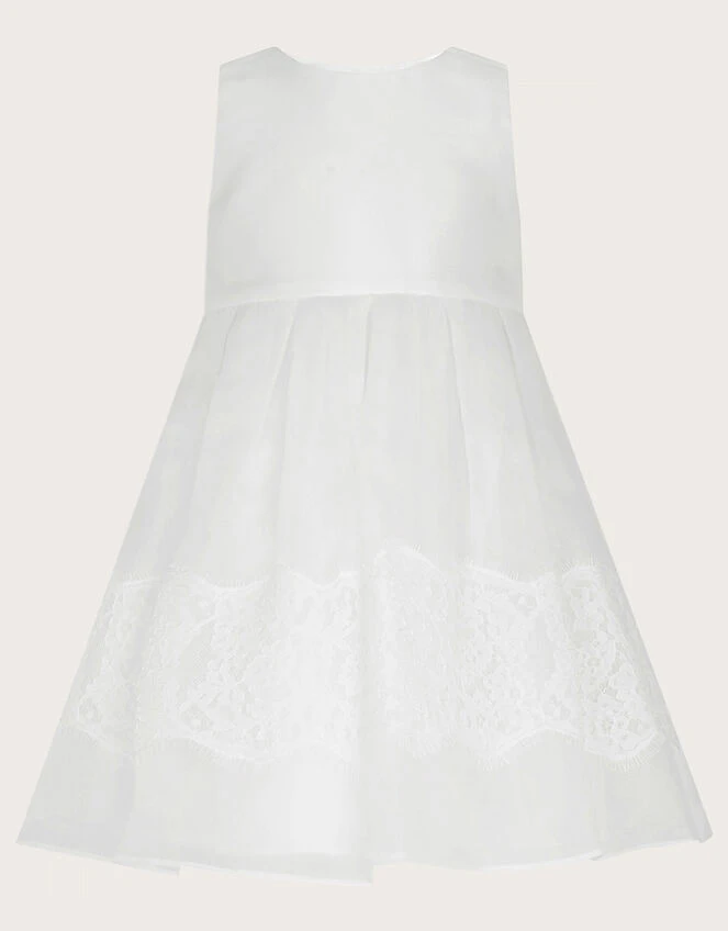 Ready and waiting for their big day, this christening dress is full of pretty detailing. From the lace panelling on the skirt, to the big beautiful bow to the back, this piece fits snuggly at the bodice for all-day comfort. White