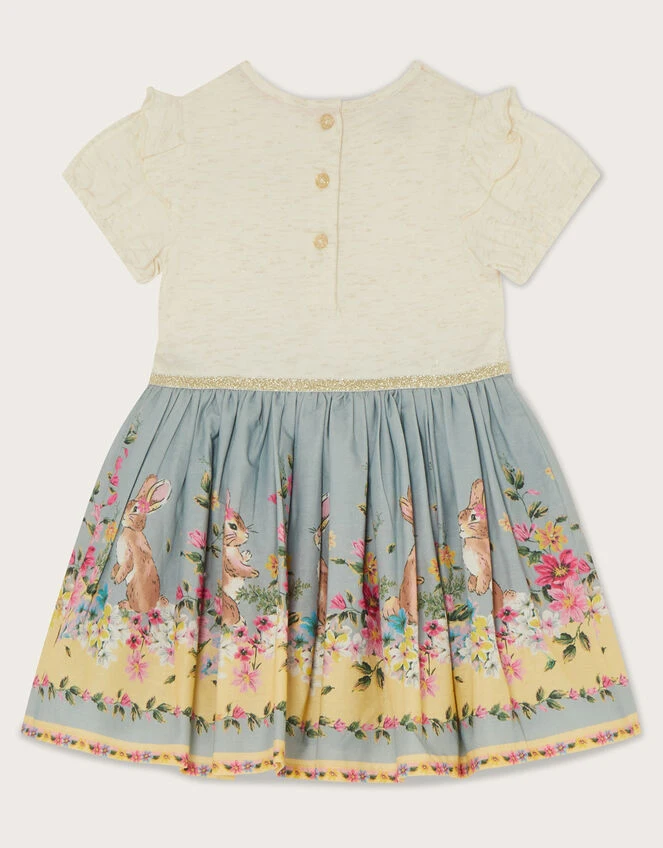 After a more comfortable and casual option for parties, whilst still playfully appropriate for everyday? This dress boasts a 2-in-1 design with a t-shirt bodice and airy pleated skirt. It features frills over the shoulders, a bow detail and a wonderland scene through the skirt – just look at those bunnies! Fastens with a buttons on the reverse.