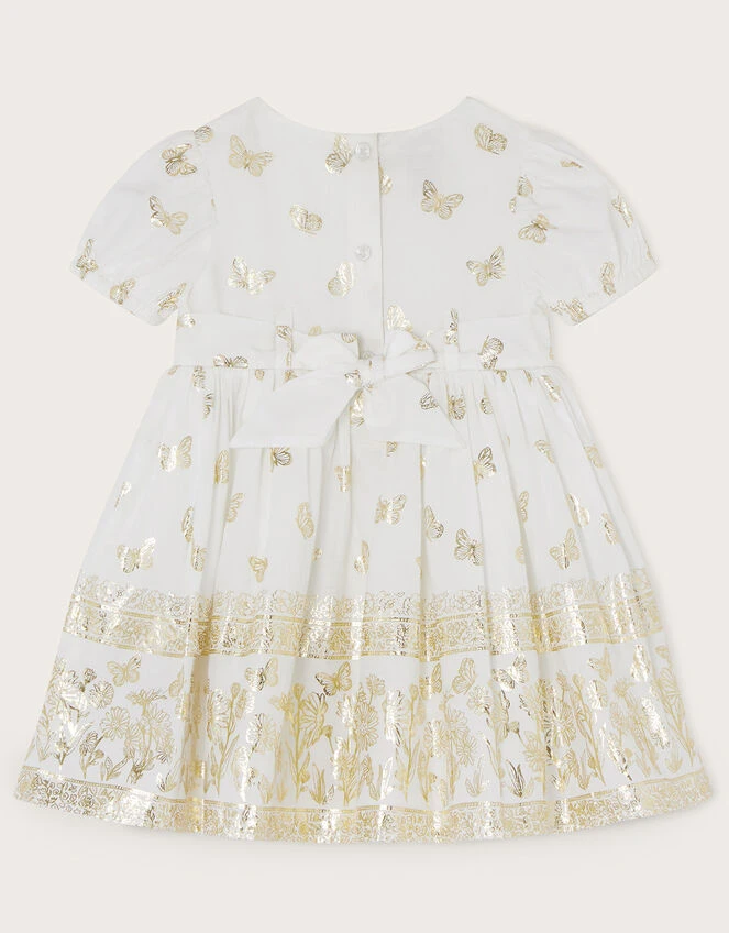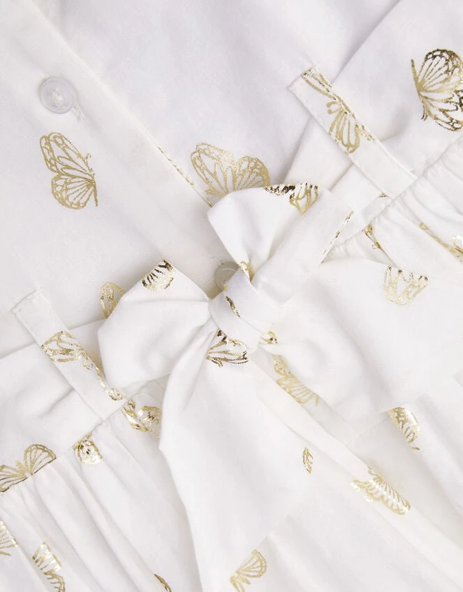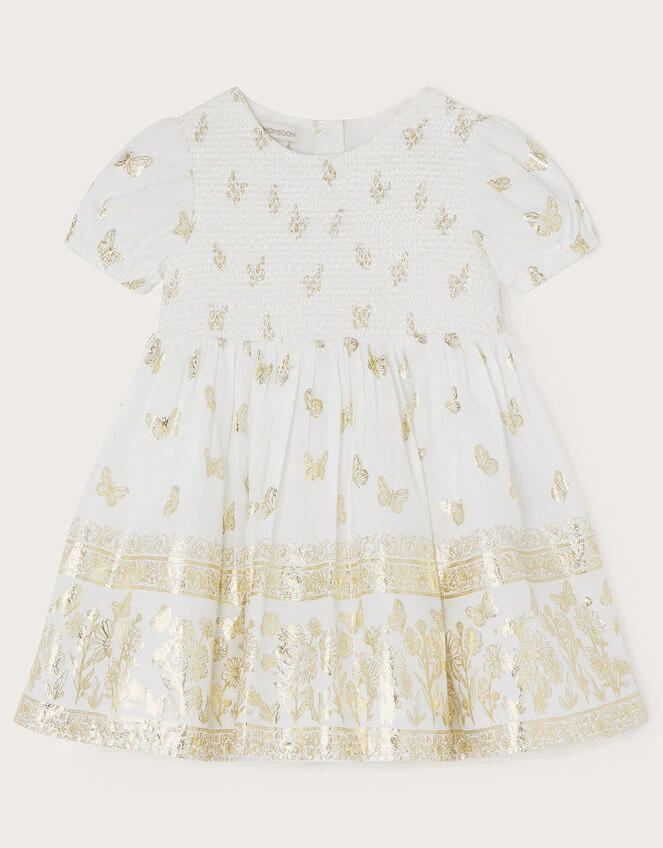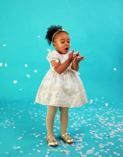 Shining with a scattering of gold butterflies, this dress is simply party-perfect. The bodice is shirred for comfort, with elasticated sleeves and a puff skirt for whirling and twirling round the dance floor.