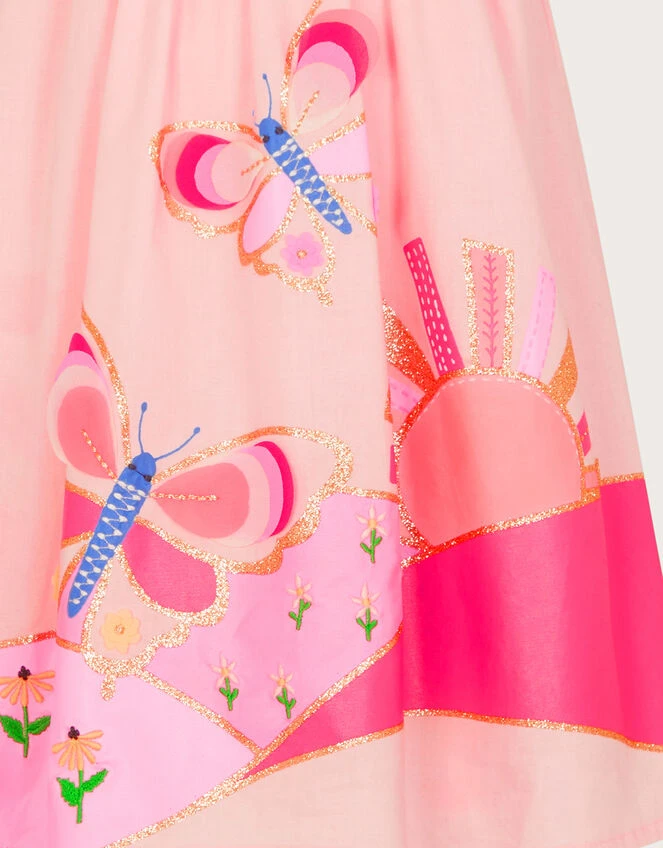 Something to dress them in as they welcome the morning, this sweet dress is cut in a simple and comfortable trapeze silhouette. The ruffle sleeves add a pretty touch, with a butterfly sunrise landscape to the front.