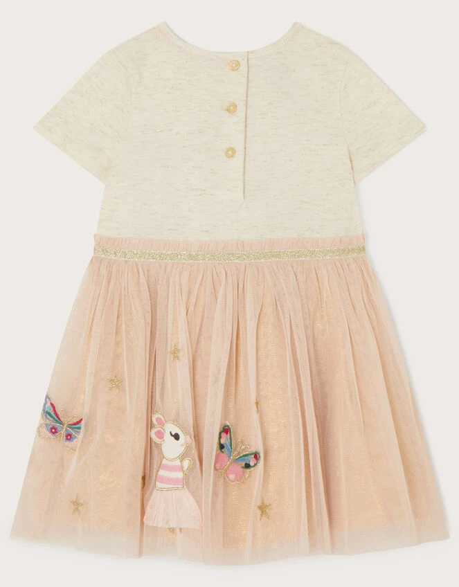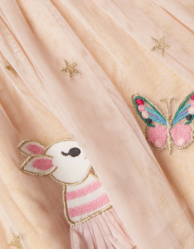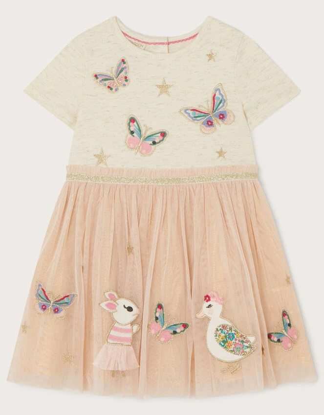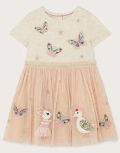 If in doubt, disco-dress them out! Featuring a friendly bunny and ditsy-print duck to the skirt, this dress has a sparkle waistband and butterfly embroidered oatmeal bodice. Fully lined and fastens with buttons to the reverse.
