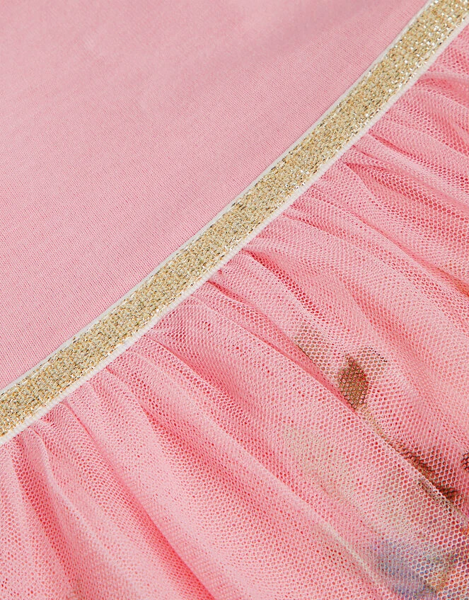 Fit for royalty, this dress is perfect for little ones on their first royal outings. The soft t-shirt features slightly puff sleeves with a sweet bow to the front and popper fastening on the reverse. The gauzy tulle skirt is illustrated with blooming florals with a sparkly gold band to the waist.