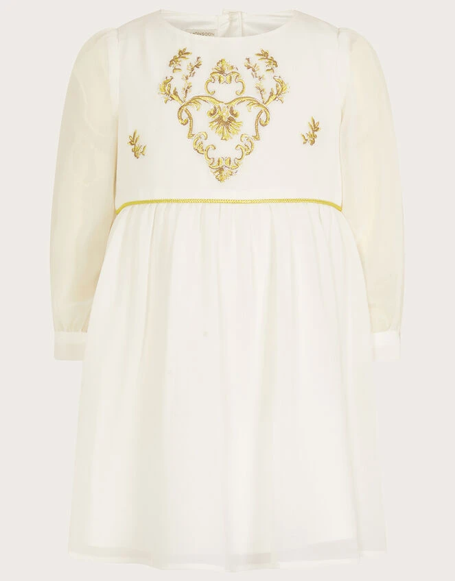 Get your little princess party ready with this dress. To the bodice is adorned with winding regal embroidery and gauzy mesh sleeves. The skirt falls from a gold band to the waist, ensuring a snug fit as they mingle around the party in the arms of friends and family. Fastens on the reverse with a button through closure. Ivory