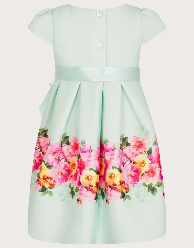 What would a Monsoon children’s dress be without some pretty flowers and pleats? Designed with an aqua backdrop, the scuba fabrication is suitably comfortable for occasions, with short sleeves and a round neckline on the bodice. Finished with a glossy ribbon to define the waist and buttons to fasten on the reverse.