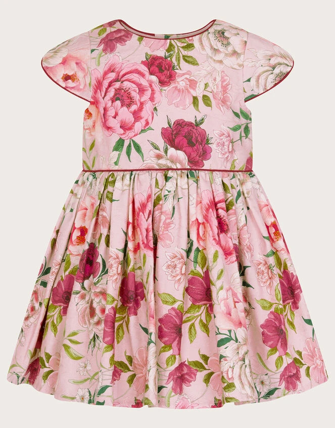 Blooming with rosey tone florals, this pretty-in-pink dress will see little ones through parties and celebrations in comfort. The bodice boasts capped sleeves, allowing movement for dancing and games on the dancefloor. The skirt is ruched at the waist, creating gentle pleats that cascade down the piece. Pink