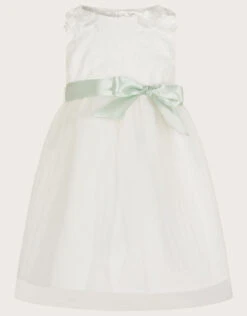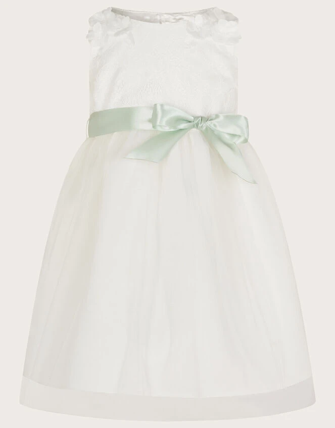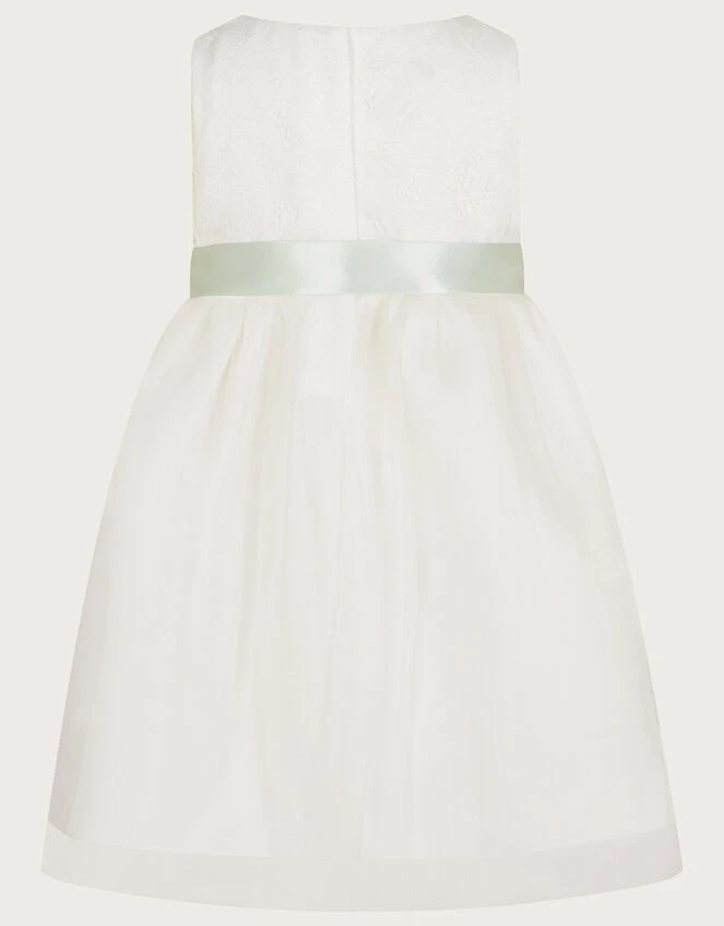 A delicate dress for little ones being bridesmaid for the day. Finished with a sleeveless lace bodice and a sage green ribbon to define the waist, this dress is simplistically beautiful for those special occasions. Fastens to the reverse with buttons.
