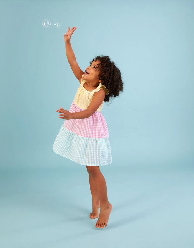Whether it’s for playdates in the sun for helping out with the gardening, this breezy cotton dress features a colour block gingham print that’ll pop against the grassy summer backdrop. The ruffle sleeves add a pretty touch, whilst the tiered profile makes for a super relaxed fit. Multi