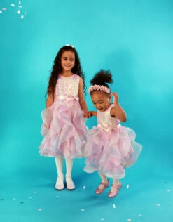 Let them live their mermaid dreams with Jojo, finished in a pretty-in-pink marble print. The bodice boasts lashings of sequins, whilst the skirt is designed with bouncy ruffles that’ll swish and sway as they take their first trip to the dancefloor. Finished with a sleek satin bow to the waist for a snug fit. Multi