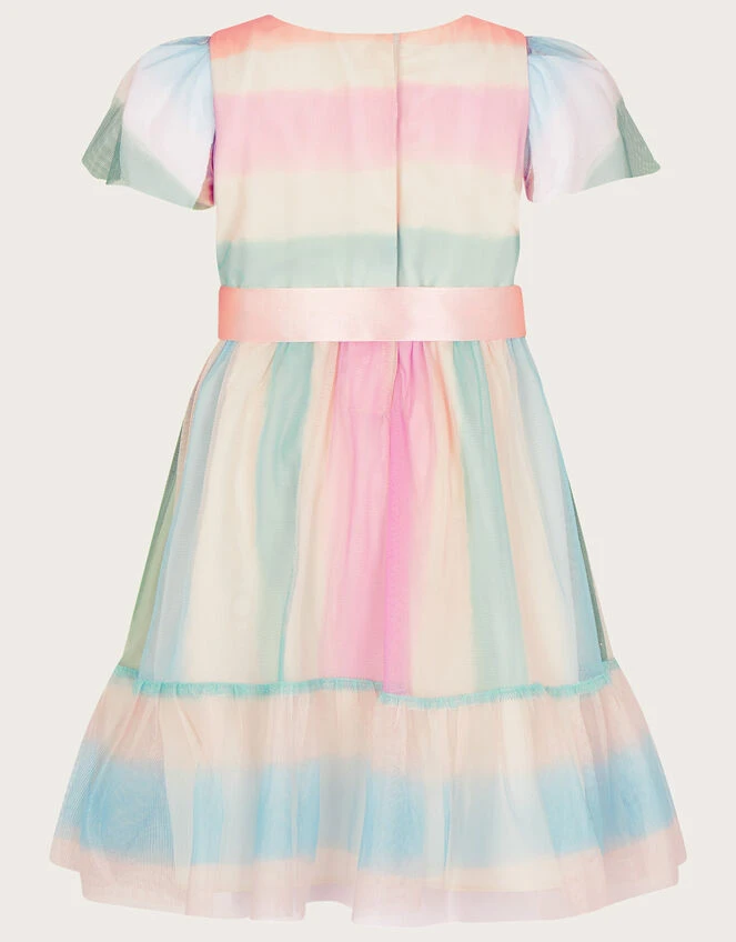 Pretty Pippa: Designed with sweet pastel stripes, your little one is sure to stand out during their first party season. The bodice features flutter sleeves, falling into a floaty skirt with a tulle overlay. It features a ruffle hem that’ll bounce around with excited kicks when they see their favourite people during the celebration. Secured with a concealed button fastening on the reverse.