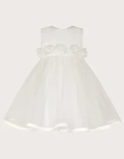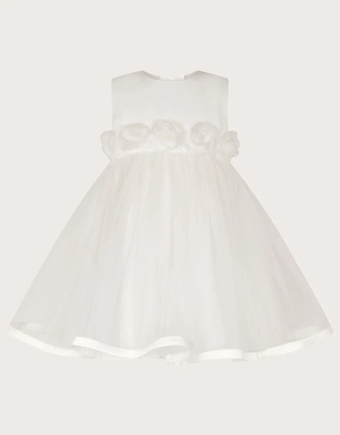 Ensuring their special day goes smoothly, this christening dress is designed in white with 3D roses to the waist, with a mesh overlay to the skirt. The sleek bodice combines a round neck and a sleeveless finish. Fastens with concealed buttons on the reverse for easy dressing.