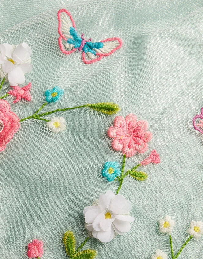Decorated with an icy sheen, this dress features a shiny overlay with ruffle detailing to the neckline, mesh sleeves, and floral embroidery to the skirt (with a few special guest butterflies).