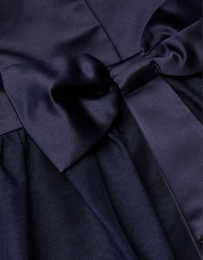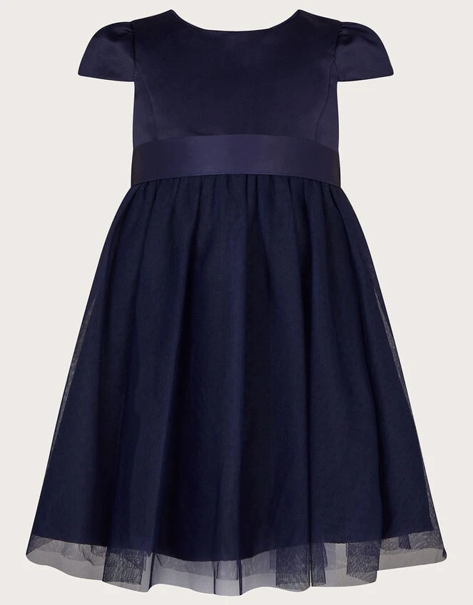 Ready to look the part, this enchanting bridesmaid dress will melt hearts. Featuring an exaggerated bow detailing to the back, this dress offers a round neck, short puff sleeves and a mesh overlay skirt. Style with matching ballerinas and a floral headband for a polished look.