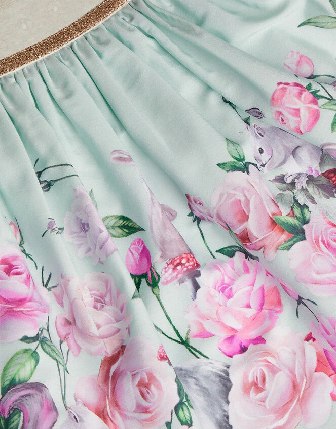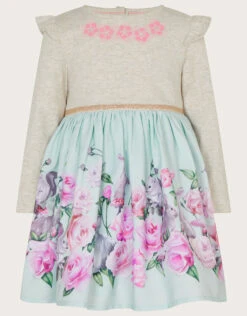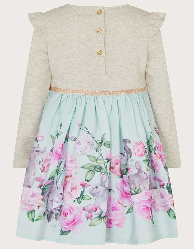 Featuring their favourite woodland friends, this dress fuses a digital print lined skirt with a floral embroidered long sleeve top. The soft top and flowy skirt allows plenty of wriggling as they see their favourite faces. Fastens on the reverse with a button closure.
