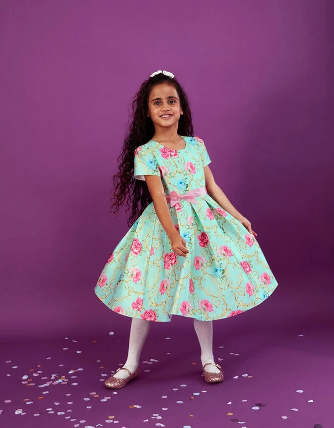Infusing party-appropriate-drama into this dress, we’ve combined classic baroque with blooming roses. The formal silhouette is designed with puff sleeves and box pleats through the skirt, with a pink bow to define the waist. Crafted in duchess twill, style it alongside spotty pink tights and ballet flats to complete the look. Green