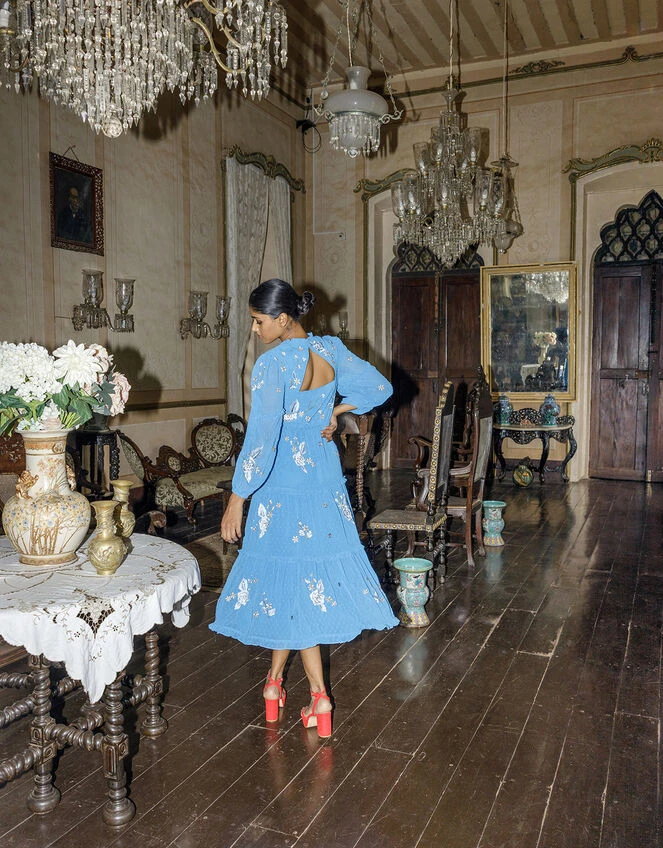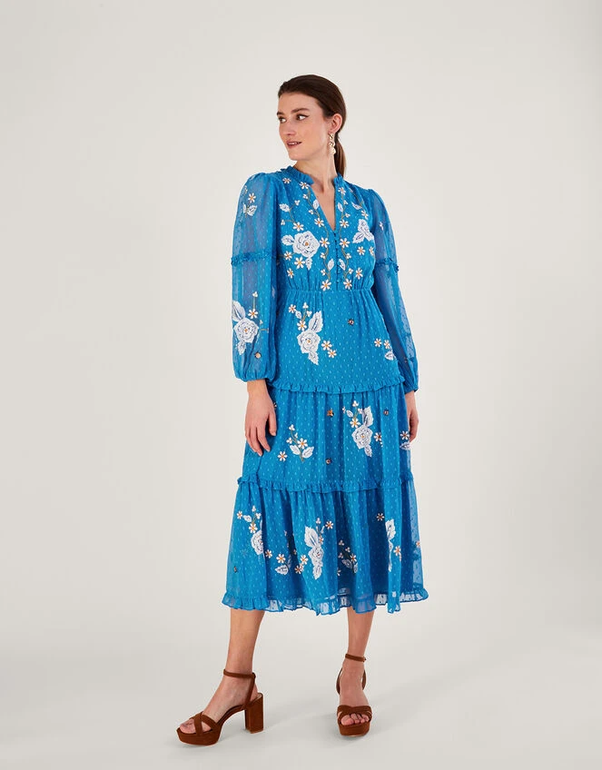 Our Belle dress takes pride in her tiered profile, topped with dobby mesh that’s embroidered with florals and buzzy bees. Doused in true blue, it’s accented with a frill Y-neckline, button details and airy mesh blouson sleeves. Falling to midi length, style with platform strappy heels to take it out for the evening.