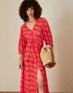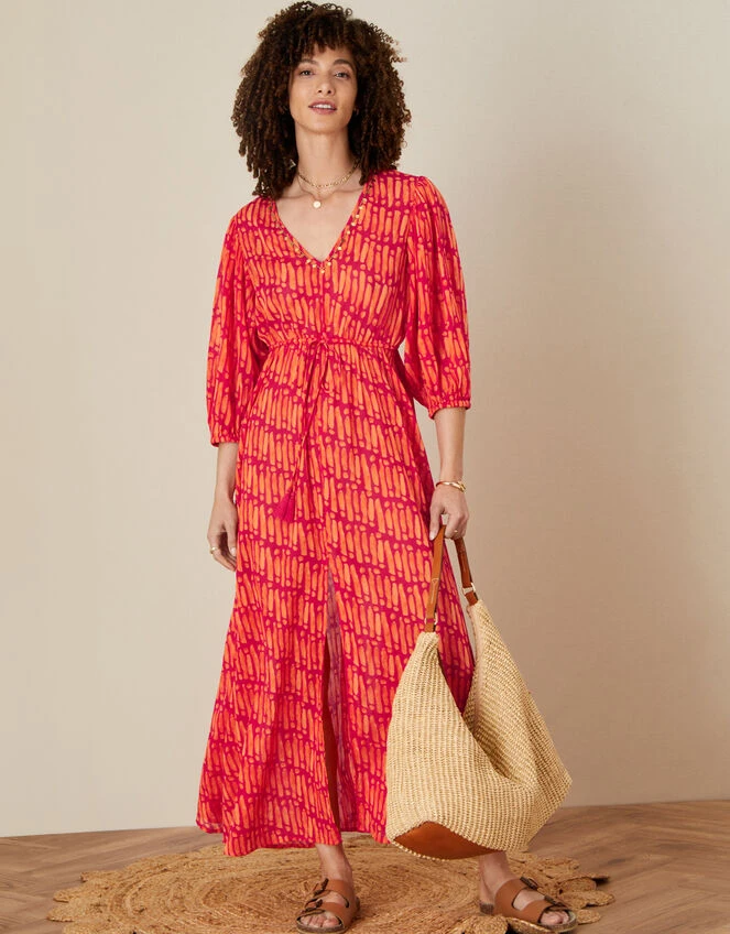Perfect for those holiday evenings, this maxi dress exudes warmth with its sunset palette. Finished with a gold-tone beaded trim and drawstring waist for a super-flattering beach look.