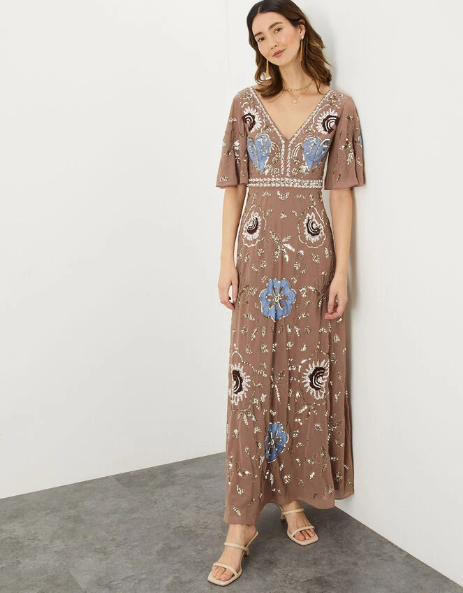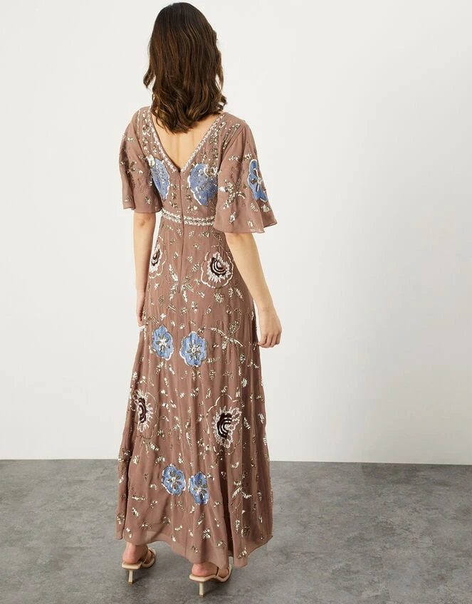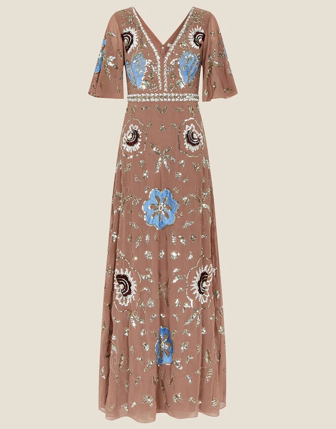 Sparkles thrive upon neutral hues with Blakely, created with recycled polyester. She features pretty flutter sleeves and a long flowing maxi skirt that will catch the wind as you mingle with fellow wedding guests.