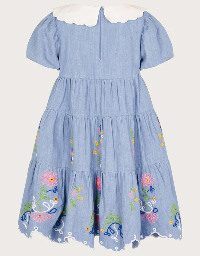 Climbing up from the hem, watch the bright, floral embroidery pave its way around the hanky hem and up through the tiers of the skirt. The tiered profile is naturally airy, with puff sleeves and a collared neckline to complete. Designed in chambray fabric with a keyhole button on the back, layer a knit jumper over the top on cooler days and watch the collar add a pretty finishing touch thanks to its scallop detailing.