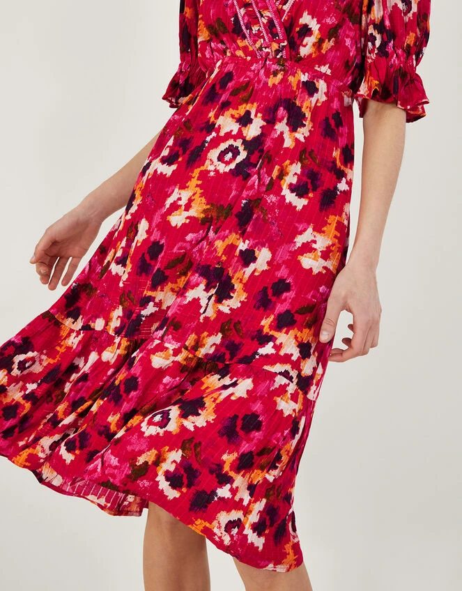 A blend of berry and fiery hues creates an unmissable palette on this dress. Designed for easygoing brunch dates, it features a wrap bodice, puff sleeves and a tiered hem, with side seam pockets for a casual touch. To finish, we’ve combined braided detailing with frills to define the v-neckline.