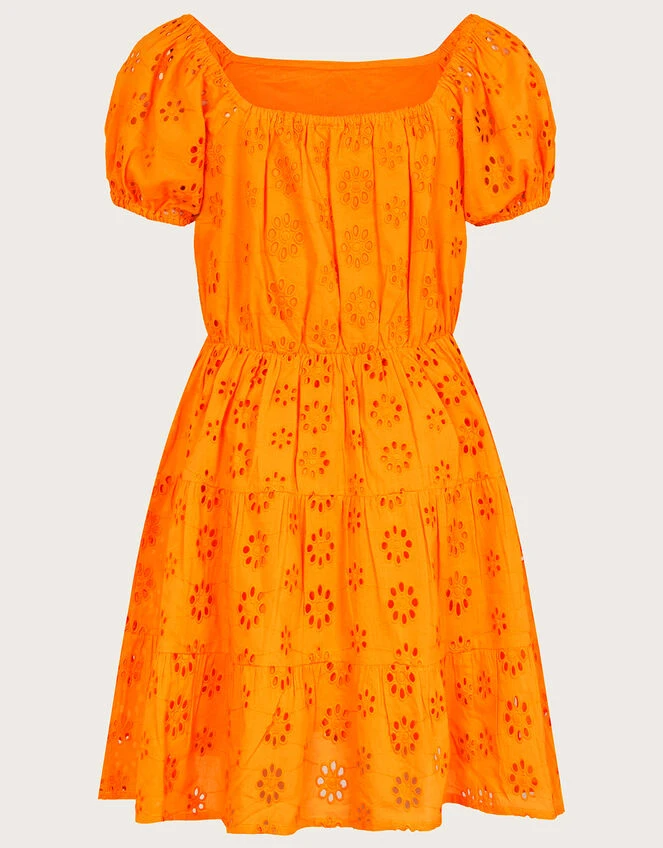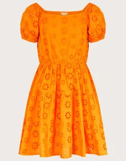 Finished in a tangy tangerine, this dress will give the sunset a run for its money! The all over broderie detailing adds a pretty touch, boasting a relaxed fit with an elasticated waistline and sleeves. Pair it with their favourite rip-tape sandals during the day, or dress it up with some strappy sparkles in the evening.