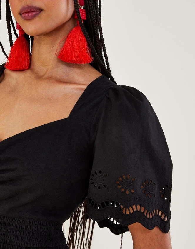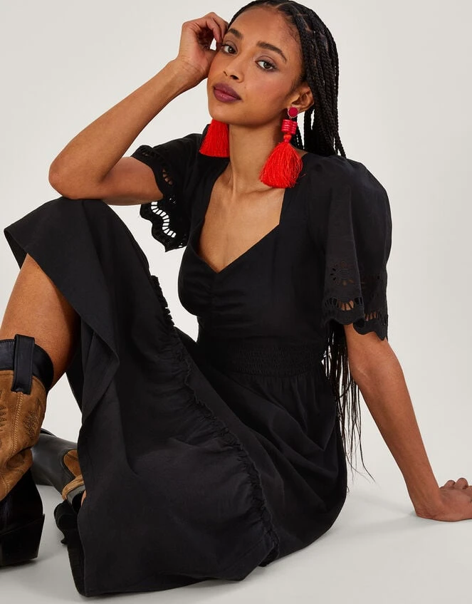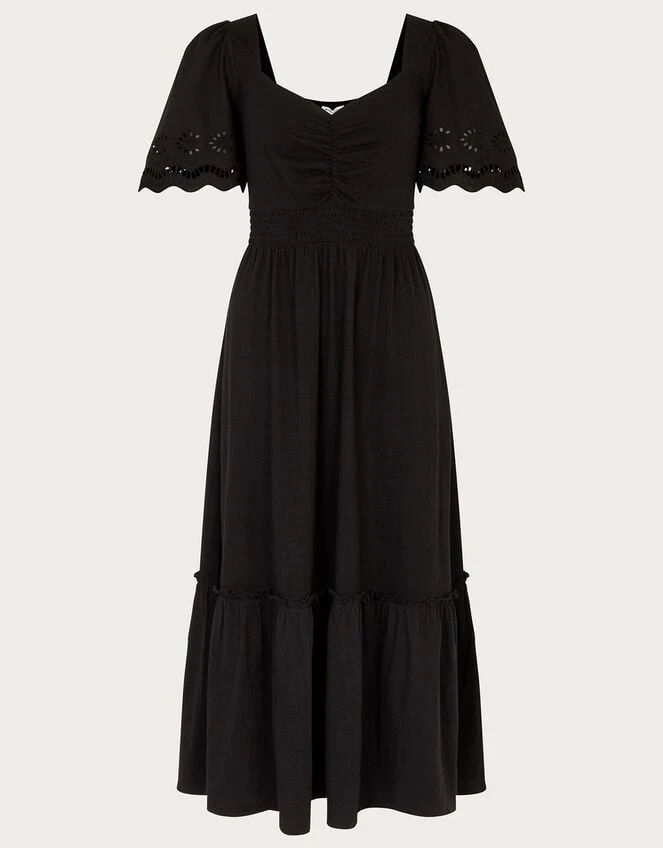 This dress brings a practical midi length to the table that transcends seasons. It features broderie detailing to the sleeves, whilst the bodice is defined with ruching and a fitted waist. We’ve finished things off with feminine touches in the sweetheart neckline and tiered hem. Spun in better-sourced cotton. Black