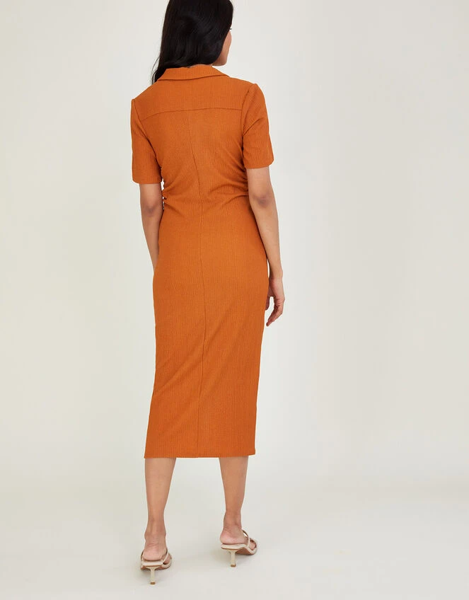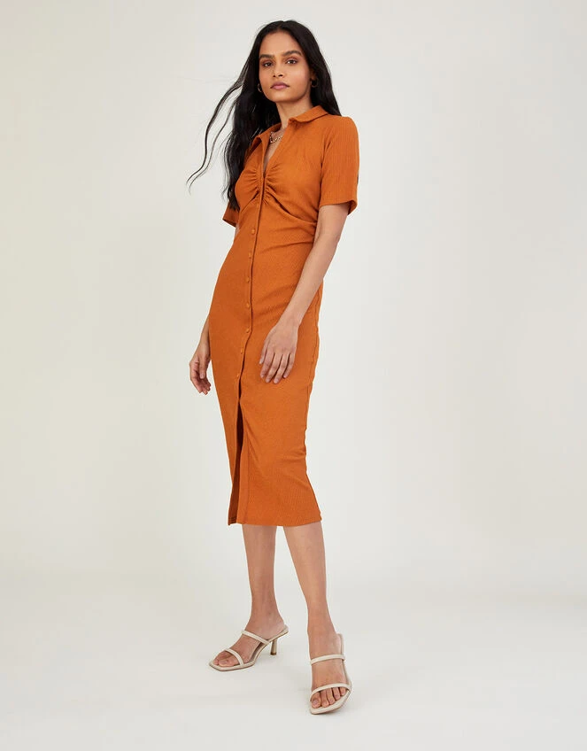 This piece is a versatile addition to your edit, designed in comfortable stretch jersey that hugs your figure gently. Feel confident with the added ruched detailing on the waist and bust, whilst the button through front lets you decide the coverage. Style with heeled mules to take it to dinner. Orange