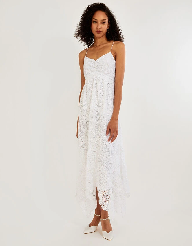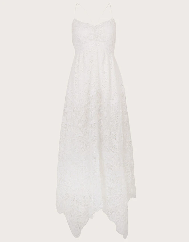 Light, airy, and of course beautifully bohemian, our Carla dress was made for brides under the sun. Designed with lace embroidery, it features a delicate strappy v-neck and handkerchief hemline that adds to the floaty effect. Style with satin white heels for a traditional touch or keep it fun with espadrille sandals. Ivory