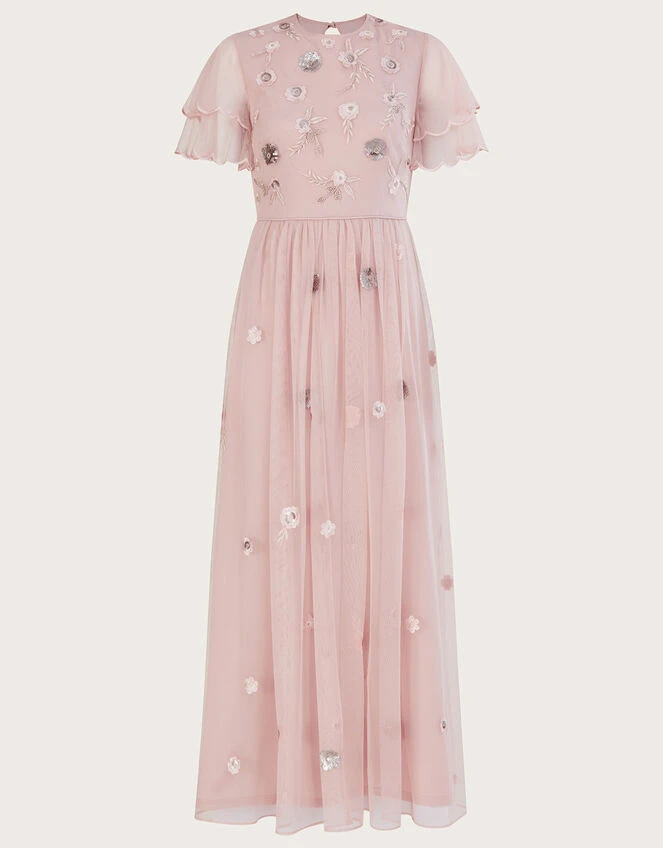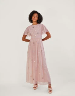 Hypnotic embellishments fall gracefully through the blush tulle on our Catherine dress, making her a special piece for special occasions. She sits fitted through the bodice with layered angel sleeves that boast a scallop trim and a floaty skirt that falls to maxi length. Spun with recycled polyester, it fastens on the reverse with an adjustable tie and a concealed zipper.