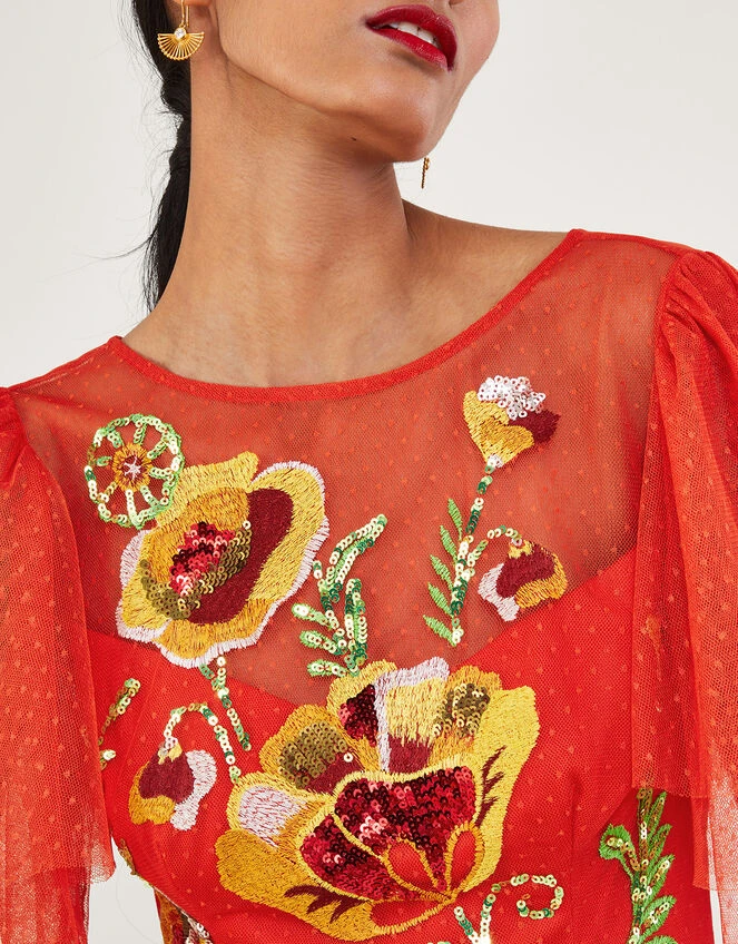 Looking for an occasion dress? Our Claudia style was made to impress with its fine embroidery and twinkly sequins. Overlaid with dobby tulle, it features tiered sleeves for a floaty finish whilst the skirt cascades to a swishy midi length. Defined at the waist with a reinforced seam, finish the look with simple ankle strap heels and a short collar necklace. Red