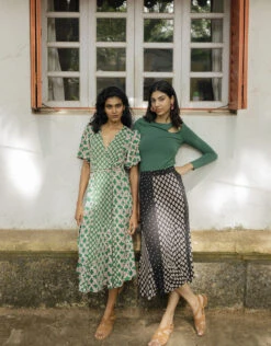 The forever complementary green and pink colour duo is found on this dress, alongside a geometric print for a look that combines bohemian with modern-chic. The silhouette itself was designed to flatter, with a wrap tie to define the waist, flutter sleeves and swishy midi skirt.