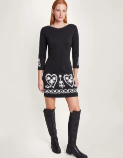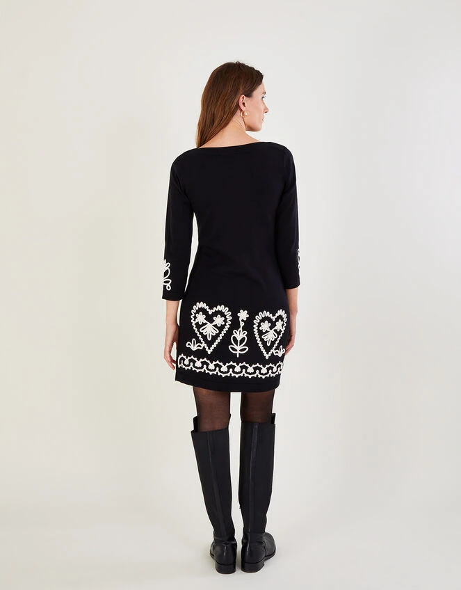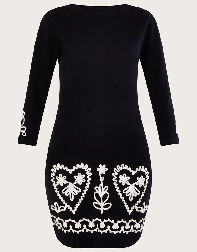 Cut in a soft tunic silhouette, this dress boasts a cut that fit for anything from the office to weekend lunches on the high street. The cornelli embroidery contrasts the black backdrop for a chic touch, winding along the hem and cuffs – just pair it with some cosy tights and your favourite knee-high boots for a glamorous finish.