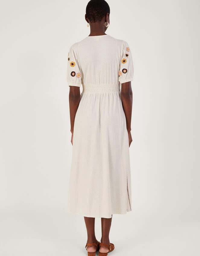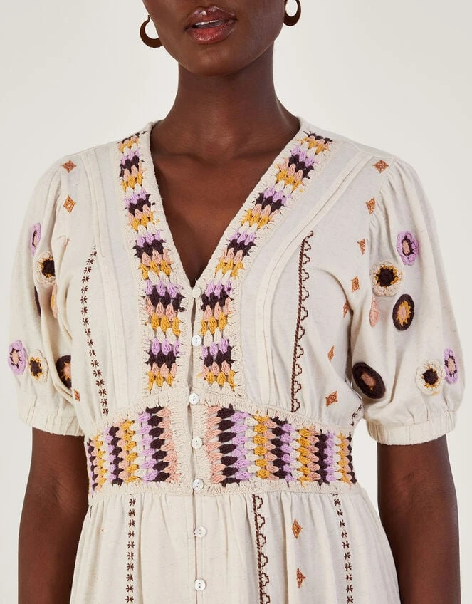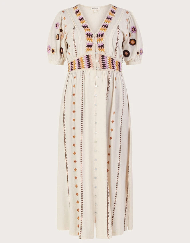 Decorated with colourful crochet to the neckline, empire line, and sleeves, this dress is spun in a lighter-than-air linen blend that’ll keep you cool during balmy summer evenings. It’s cut in a simple tea silhouette, with a button through fastening, and puff sleeves for a feminine finish.