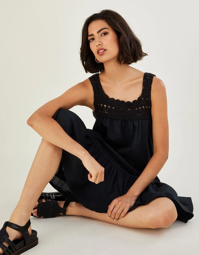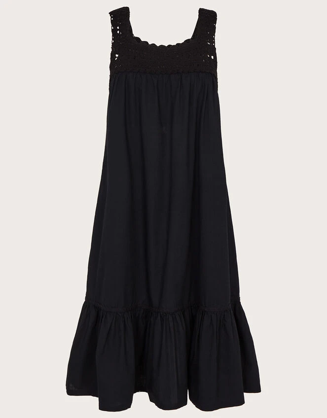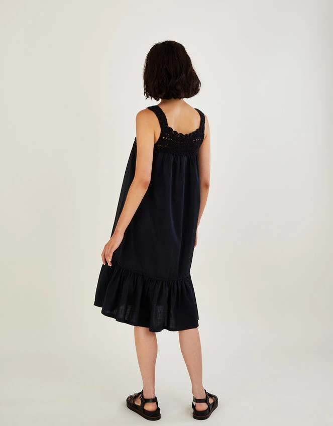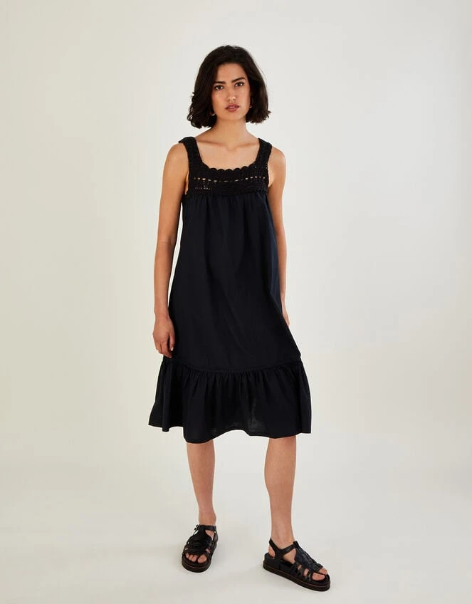 Want to wear black but the temperature’s rising? We understand. Stay cool in this midi dress, combining a breathable crochet trim with a crispy cotton body. It styles perfectly with a floppy hat, black chunky sandals and a straw tote bag.