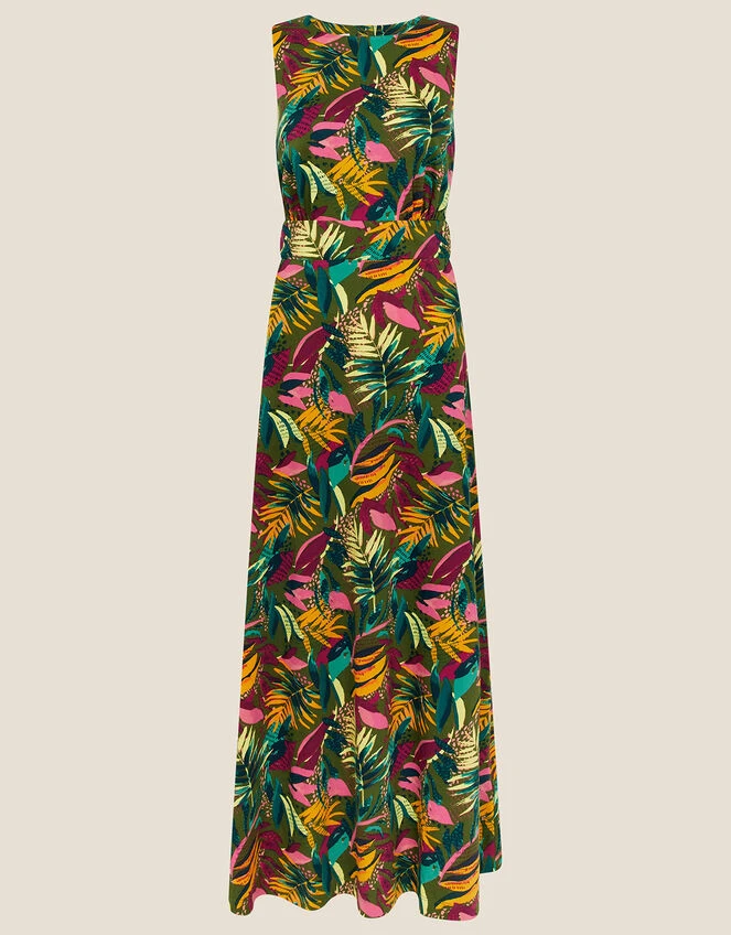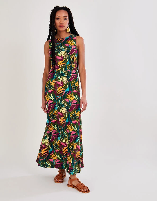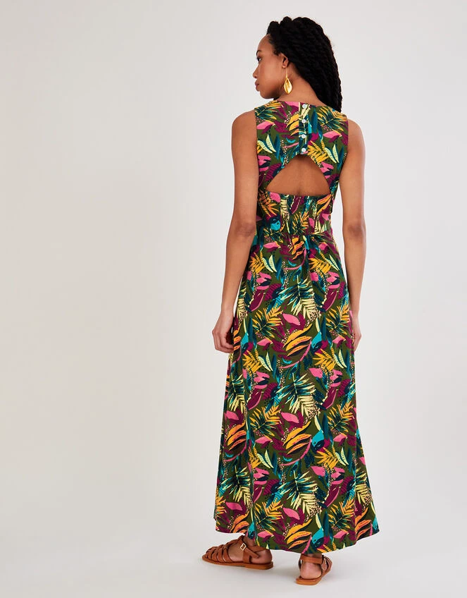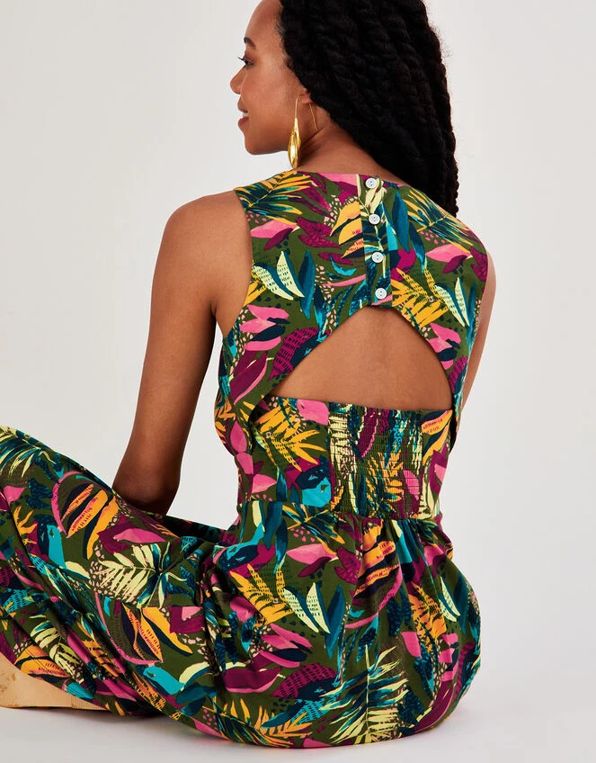 Stand out amongst the sandy backdrop in this dress. It features a vibrant topical print on a khaki backdrop, with cut-out detailing to the back. Created in a soft sustainable cotton, this piece will keep you cool as you stroll along the marina.