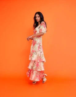 A romantic piece for special occasions, this dress boasts a pretty botanical print. Its sweetheart neckline and puff sleeves creates a flattering bodice, that falls beautifully into a flowing tiered skirt. Natural
