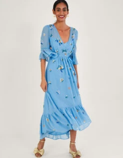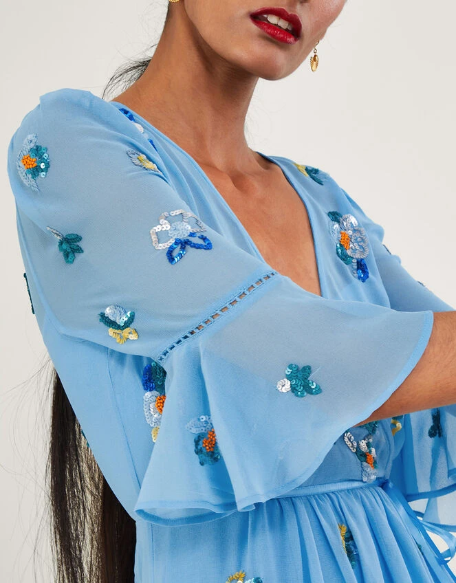 This sky blue midi dress is a whimsical style for events. Wrapping around the bodice, it combines elbow-length angel sleeves with a v-neckline that we think would pair beautifully with a dainty necklace. Falling into a swishy midi skirt, the tiered hem hangs slightly longer at the back whilst still showing off your strappy heels below.