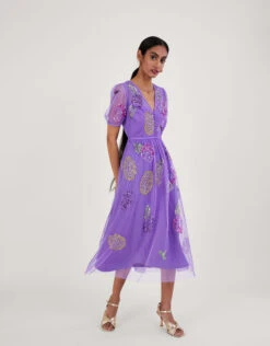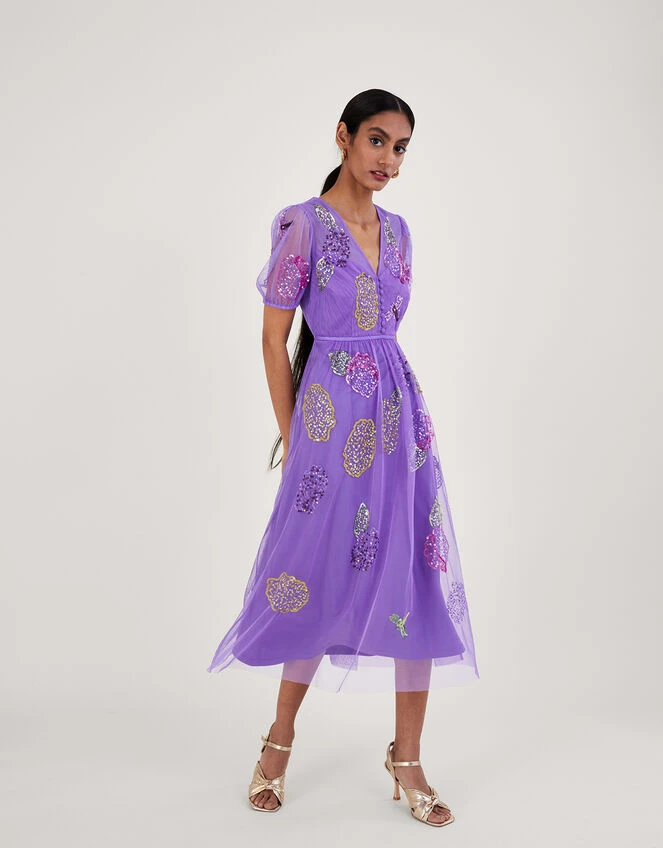 Dare to sparkle in our Diana dress, designed in purple fabric with a whimsical mesh overlay. We’ve put an elevated spin on its classic tea silhouette, with puff sleeves and a cut-out detail to the back, whilst a band sits around the waist for added definition. Complete with fabric buttons through the chest, the sequin embellishments are what brings the design a twinkly finish.